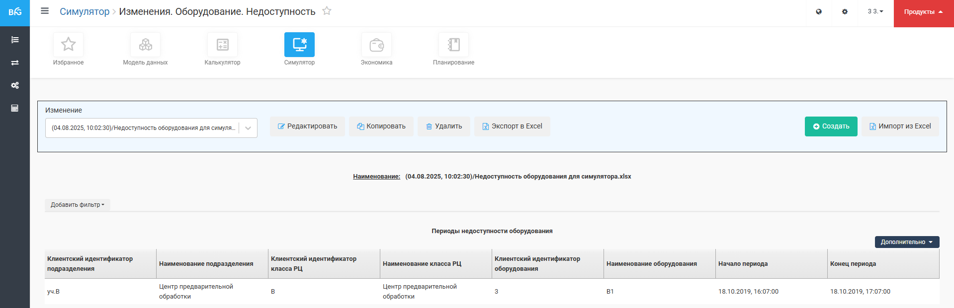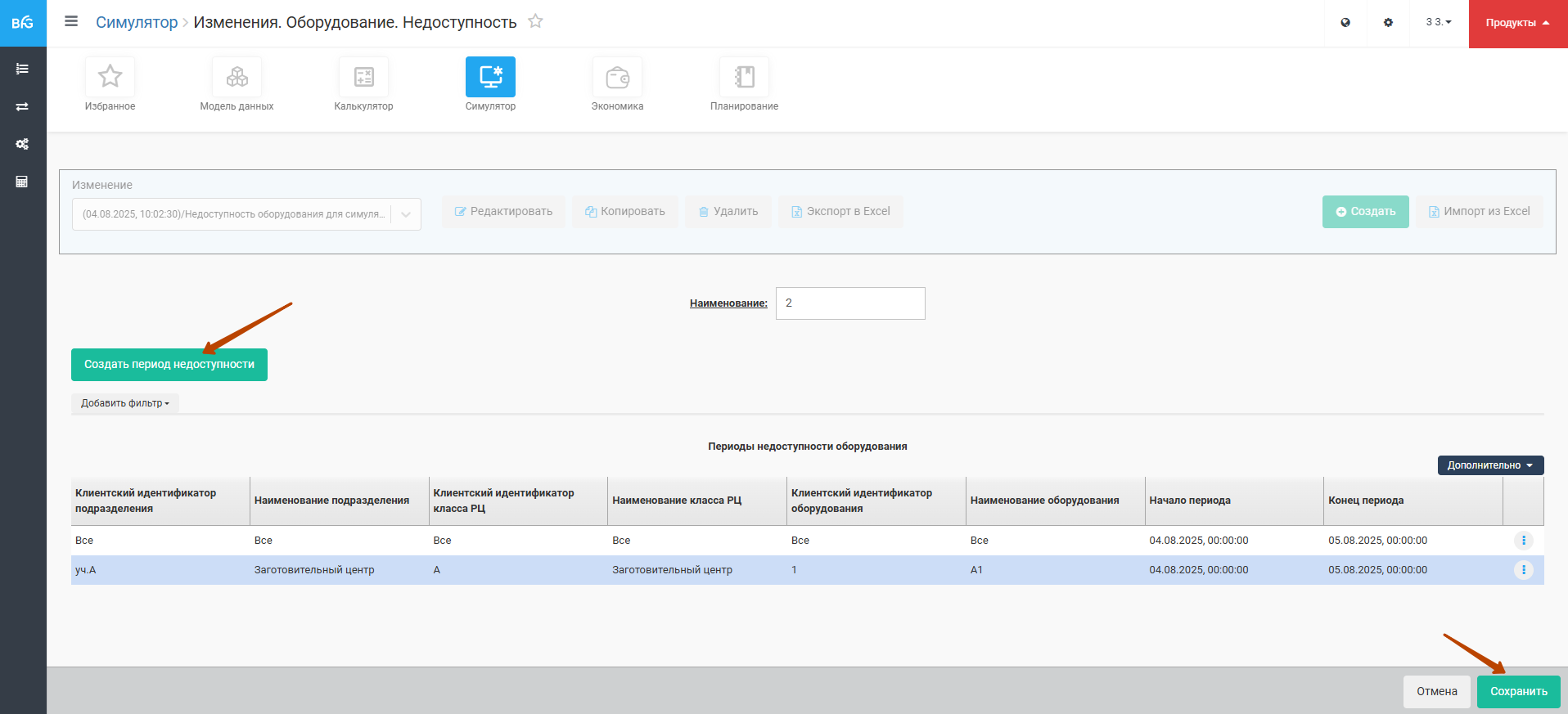 Для создания изменения внутри системы нужно пройти по пути Изменения - Оборудование - Недоступность (из разделов Симулятор или Планирование):