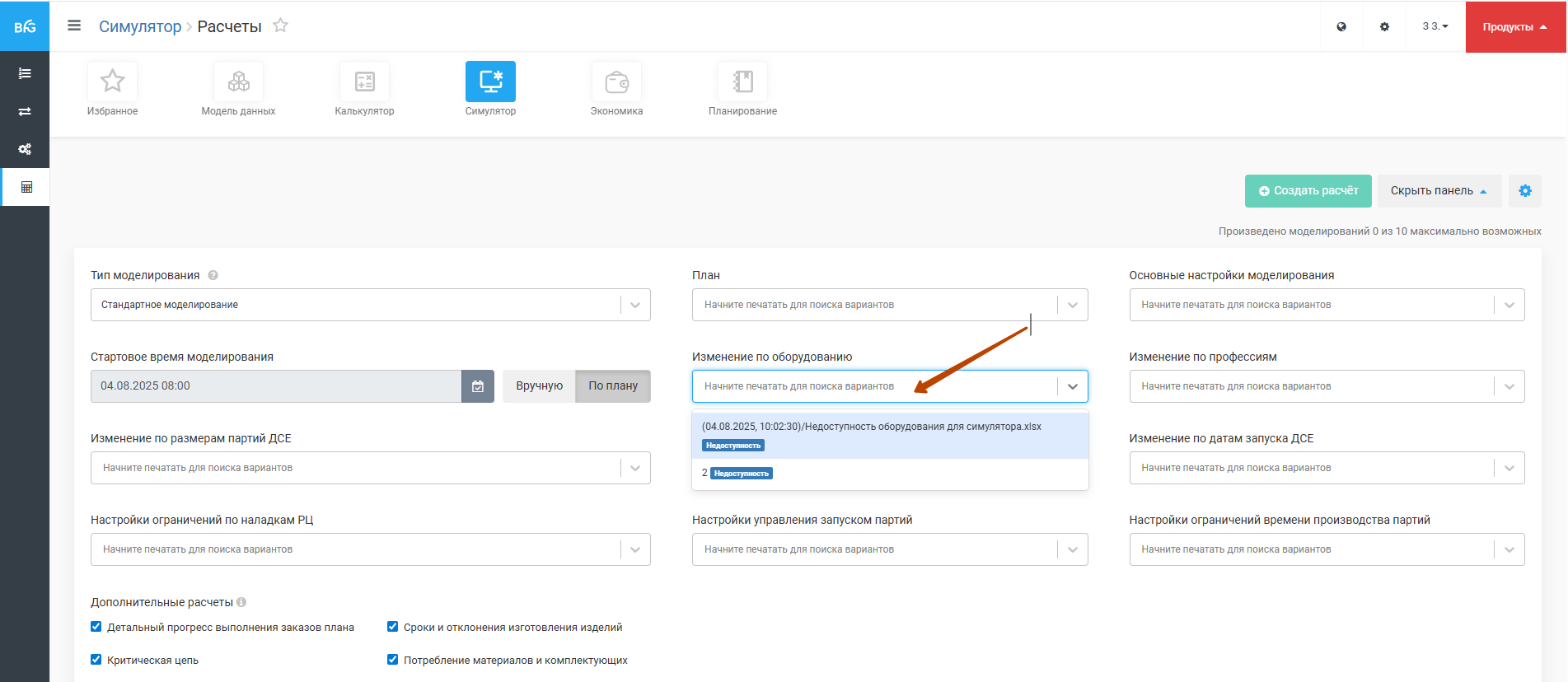 Для создания расчета с созданным изменением по недоступности оборудования его нужно выбрать в поле "Изменение по оборудованию" в окне запуска расчета в разделах Симулятор или Планирование: