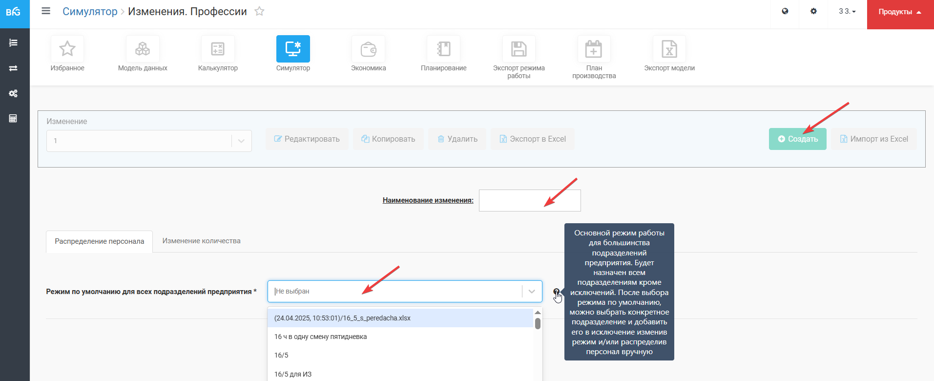 Назначение расписаний персоналу возможно как с помощью импорта файла изменений, так и путем создания изменения, как показано ниже. Для этого нужно выбрать «Создать», ввести наименование изменения и выбрать из предлагаемого списка режим работы по умолчанию (который назначится всем подразделениям):